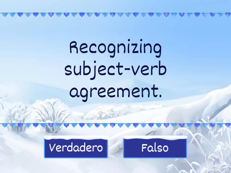 Verdadero: Recognizing subject-verb agreement., Understanding sentence structure., Identifying parts of speech., Analyzing punctuation usage., Grasping word order in sentences., Falso: Misinterpreting basic grammar rules., Ignoring sentence structure altogether., Failing to distinguish between nouns and verbs., Misplacing punctuation marks randomly., Jumbling words without regard for syntax.,