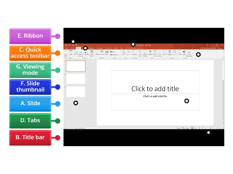 A. Slide, B. Title bar, C. Quick access toolbar, D. Tabs, E. Ribbon, F. Slide thumbnail, G. Viewing mode.