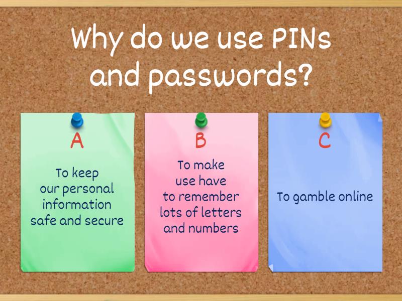 1) Why do we use PINs and passwords? a) To keep our personal information safe and secure b) To make use have to remember lots of letters and numbers c) To gamble online 2) What is another name for a PIN? a) Password b) Passcode c) Permission 3) Why is is important to have a good sitting posture when using a computer? a) To prevent an RSI b) To sit uncomfortably c) Because your tutor says so 4) What does RSI stand for? a) Remember spaces in writing b) Repetitive Steam Inhalation c) Repetitive Strain Injury 5) How often should you take breaks away from a computer? a) 5-10 minutes every hour b) 5-10 minutes every 2 hours c) 20 minutes every 3 hours 6) Why should you take breaks away from the computer? a) To sing and dance and pretend you're in France b) To prevent an RSI or eye fatigue c) To prevent yourself from having to do any work 7) What should you do if you see any broken IT equiptment a) Report it to IT services and do not touch it yourself b) Report it to the fairies who will wave a magic wand and make it disappear c) Report it to the cafe staff and then throw it out the window.