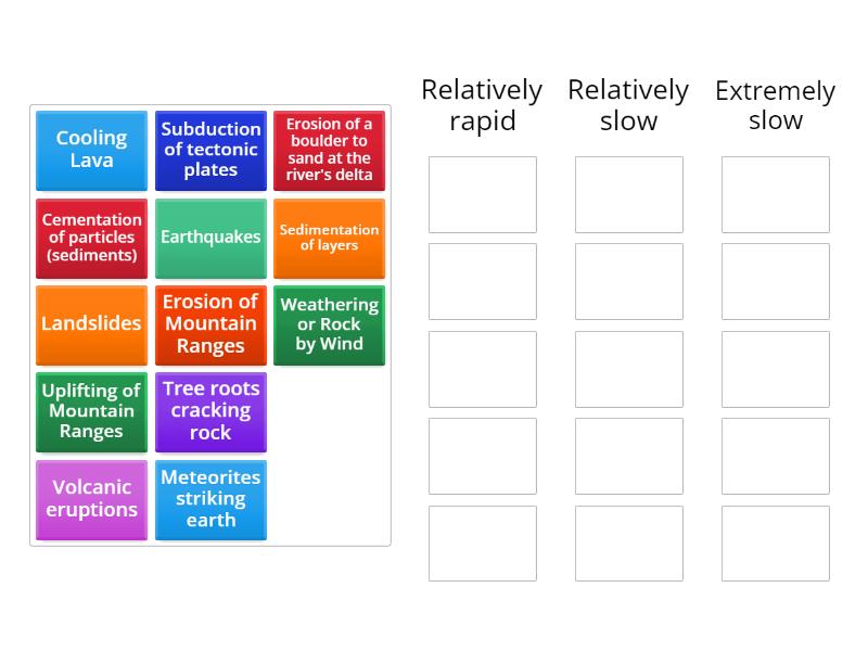 Relatively rapid: Earthquakes, Landslides, Volcanic eruptions, Meteorites striking earth, Cooling Lava, Relatively slow: Weathering or Rock by Wind, Tree roots cracking rock, Erosion of a boulder to sand at the river's delta, Subduction of tectonic plates, Extremely slow: Sedimentation of layers, Cementation of particles (sediments), Uplifting of Mountain Ranges, Erosion of Mountain Ranges,