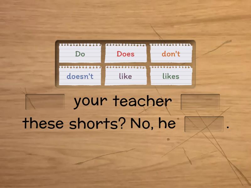 ____ your teacher ____ these shorts? No, he ____. Do you ____ computer games? Yes, I ____. ____ he ____ tennis? Yes, he does. She ____ football. Does he ____ football? No, he ____. He ____ playing chess, but he ____ ____ swimming. She ____ playing basketball. But they ____ ____ ball games. We like sports. ____ you ____ sports? They like playing the piano, but they ____ ____ singing. ____ he ____ running? No, he ____. She ____ skating and skiing. He ____ ____ winter sports.