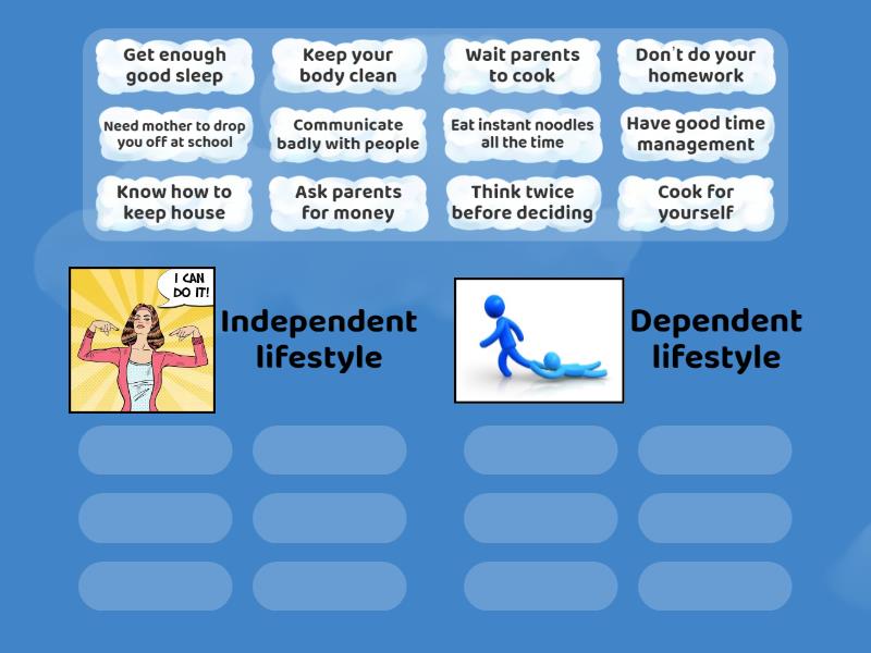 Independent lifestyle: Cook for yourself, Have good time management, Know how to keep house, Keep your body clean, Think twice before deciding, Get enough good sleep, Dependent lifestyle: Ask parents for money, Wait parents to cook, Don’t do your homework, Need mother to drop you off at school, Communicate badly with people, Eat instant noodles all the time,