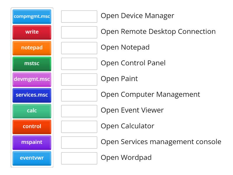 control - Open Control Panel, notepad - Open Notepad, mspaint - Open Paint, write - Open Wordpad, calc - Open Calculator, mstsc - Open Remote Desktop Connection, devmgmt.msc - Open Device Manager, compmgmt.msc - Open Computer Management, eventvwr - Open Event Viewer, services.msc - Open Services management console,