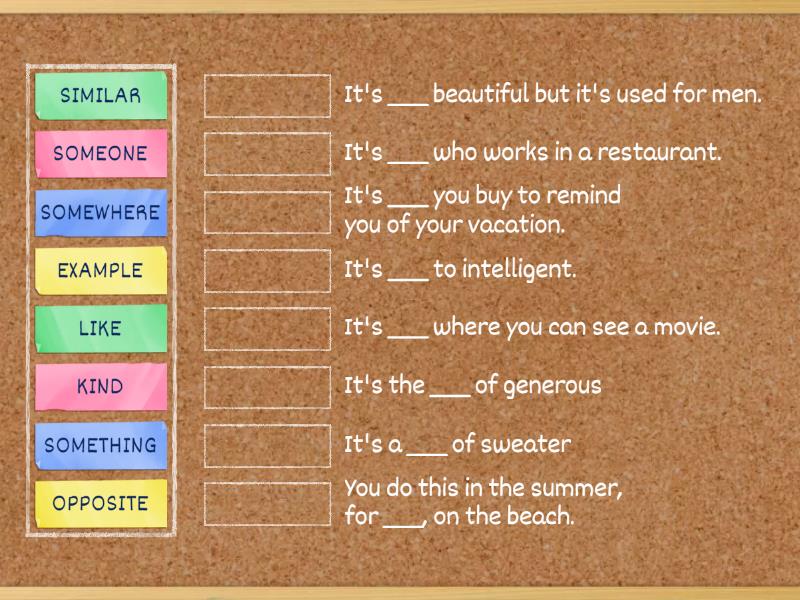 KIND - It's a ___ of sweater, OPPOSITE - It's the ___ of generous, SIMILAR - It's ___ to intelligent., LIKE - It's ___ beautiful but it's used for men., SOMETHING - It's ___ you buy to remind you of your vacation., EXAMPLE - You do this in the summer, for ___, on the beach., SOMEONE - It's ___ who works in a restaurant., SOMEWHERE - It's ___ where you can see a movie.,