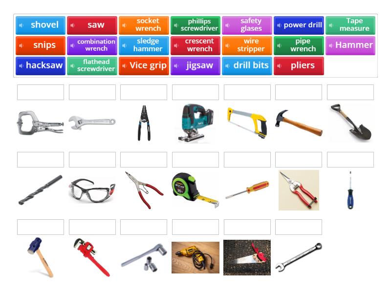 Hammer, flathead screwdriver, phillips screwdriver, Tape measure, Vice grip, sledge hammer, safety glases, pipe wrench, socket wrench, combination wrench, saw, jigsaw, pliers, hacksaw, snips, crescent wrench, wire stripper, shovel, power drill, drill bits,