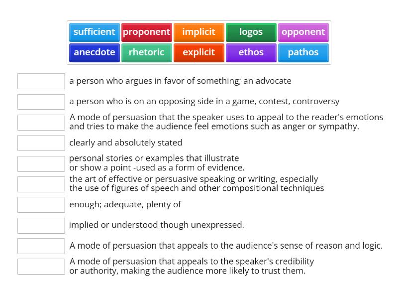 opponent - a person who is on an opposing side in a game, contest, controversy , implicit - implied or understood though unexpressed., explicit - clearly and absolutely stated, anecdote - personal stories or examples that illustrate or show a point -used as a form of evidence., ethos - A mode of persuasion that appeals to the speaker's credibility or authority, making the audience more likely to trust them., pathos - A mode of persuasion that the speaker uses to appeal to the reader's emotions and tries to make the audience feel emotions such as anger or sympathy., logos - A mode of persuasion that appeals to the audience's sense of reason and logic., rhetoric - the art of effective or persuasive speaking or writing, especially the use of figures of speech and other compositional techniques, sufficient - enough; adequate, plenty of, proponent - a person who argues in favor of something; an advocate,