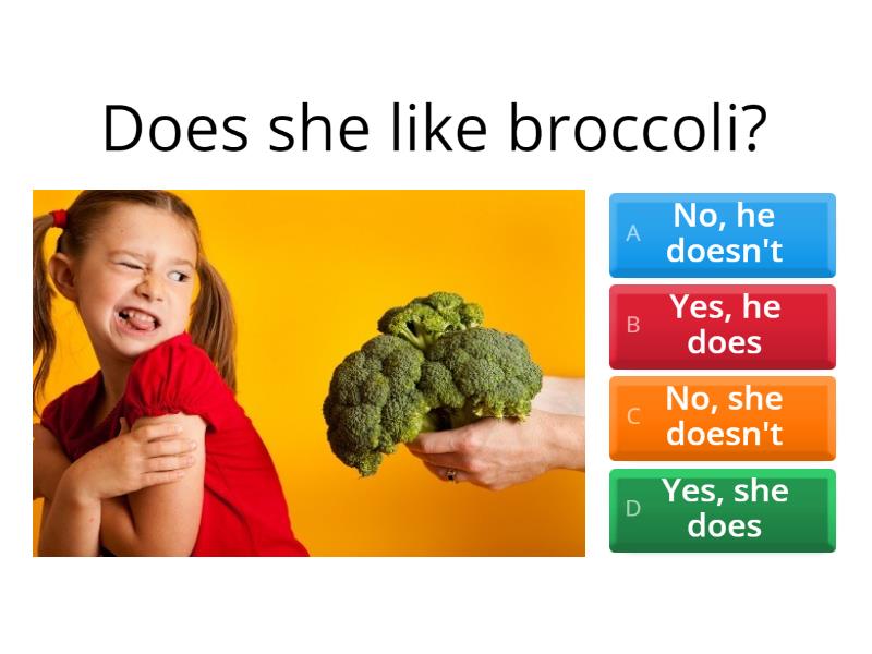 1) Does she like broccoli? a) No, he doesn't b) Yes, he does c) No, she doesn't d) Yes, she does 2) Does ____ like nuts? a) do b) does c) doesn't d) he e) she 3) _________ she like lentils? a) Doesn't  b) Does c) Do d) He e) She 4) Does he like pizza? a) Yes, he does b) No, he doesn't c) No, she does d) Yes, you don't 5) Does ____ like pasta? a) do b) does c) doesn't d) he e) she 6) Does Sofia like yoghurt? a) Yes, she does b) No, he doesn't c) Yes, he does d) No, she doesn't 7) _______ he like prawns? a) Does b) Doesn't c) Do d) He e) She 8) _____ you like bananas? a) Does b) Doesn't c) Do d) He e) She 9) He ________ honey a) likes b) like c) don't like d) doesn't like 10) Does she like tuna? a) No, she doesn't b) No, he doesn't c) Yes, she does d) Yes, he does 11) Does ____ like vegetables? a) do b) does c) doesn't d) she e) he 12) He __________ like cheese. a) like b) likes c) doesn't d) don't 13) ______ my brother like lentils? a) Do b) Doesn't c) Does 14) Does ____ like fruit? a) he b) she c) do d) doesn't e) does 15) She _________ chicken. a) like b) likes c) don't like d) doesn't like 16) She __________ vegetables. a) like b) likes c) don't like d) doesn't like