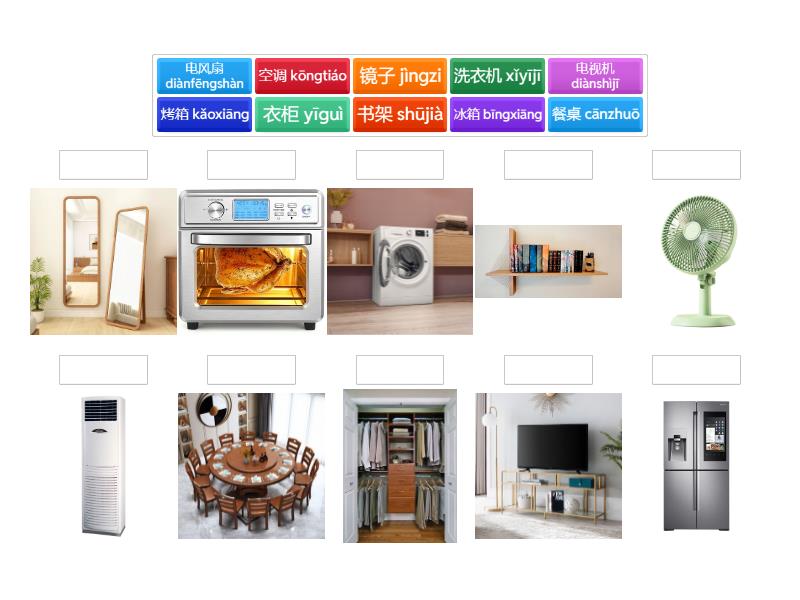 洗衣机 xǐyījī, 空调 kōngtiáo, 烤箱 kǎoxiāng, 餐桌 cānzhuō, 衣柜 yīguì, 书架 shūjià, 冰箱 bīngxiāng, 电视机 diànshìjī, 镜子 jìngzi, 电风扇 diànfēngshàn,