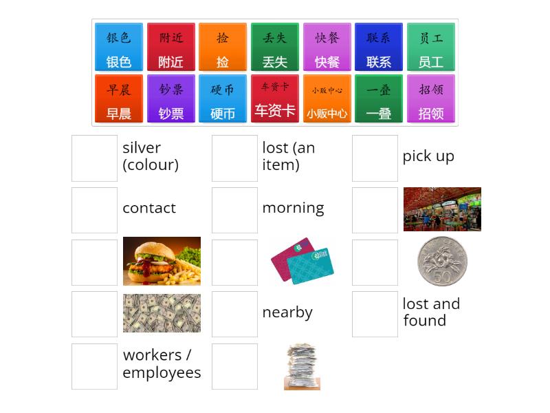 附近 - nearby , 小贩中心, 丢失 - lost (an item), 银色 - silver (colour), 车资卡, 一叠, 钞票, 硬币, 捡 - pick up , 联系 - contact , 招领 - lost and found , 早晨 - morning , 员工 - workers / employees , 快餐,