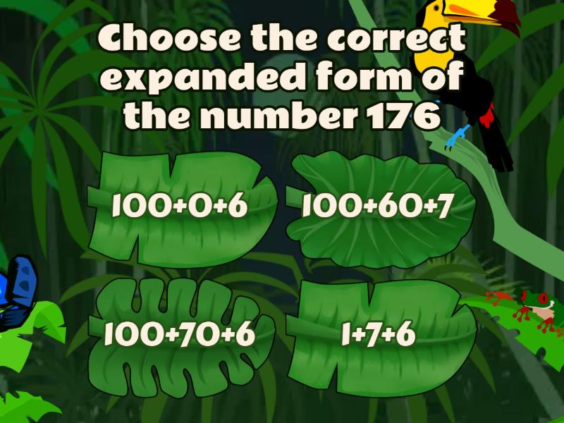 1) Choose the correct expanded form of the number 176 a) 100+0+6 b) 100+60+7 c) 100+70+6 d) 1+7+6 2) The standard form for 100+90+8 is a) 189 b) 198 c) 190 d) $198.00 3) Is this an example of Standard Form or Expanded form? 100+20+7 a) expanded form b) standard form 4) The word form of 100 372 is: a) one hundred three hundred seventy two b) one thousand three hundred seventy two c) one hundred thousand three hundred seventy two d) ten thousand three hundred seventy two 5) True or False: 10,000 + 4,000 + 300 + 22 is the correct way of writing 14,322 in EXPANDED FORM? a) True b) Fals 6) True or False: ONE HUNDRED is written the same in standard form an expanded form? a) True b) False 7) True or False: 100.5 is can be shown in word form as ONE HUNDRED AND FIVE TENTHS? a) TRUE b) FALSE 8) TRUE OR FALSE: 100.5 is the same as 100.50 a) TRUE b) FALSE 9) What is the expanded form of 46,051? a) 40,000 + 6,000 + 0 + 50 + 1 b) 4,000 + 6,000 + 0 + 50 c) 40,000 + 6,000 + 0 + 51 d) 40,000 + 6,000 + 50 + 1 10) What is the standard form of 80,000 + 2,000 + 100 + 40 + 5 a) eighty-two thousand one hundred forty five b) $82,145.00 c) 82,145 d) 82 145
