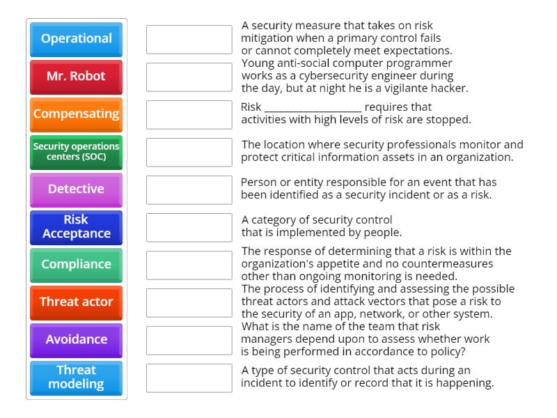 Mr. Robot - Young anti-social computer programmer works as a cybersecurity engineer during the day, but at night he is a vigilante hacker., Security operations centers (SOC) - The location where security professionals monitor and protect critical information assets in an organization., Risk Acceptance - The response of determining that a risk is within the organization's appetite and no countermeasures other than ongoing monitoring is needed., Threat modeling - The process of identifying and assessing the possible threat actors and attack vectors that pose a risk to the security of an app, network, or other system., Compliance - What is the name of the team that risk managers depend upon to assess whether work is being performed in accordance to policy?, Avoidance - Risk ____________________ requires that activities with high levels of risk are stopped., Operational - A category of security control that is implemented by people., Detective - A type of security control that acts during an incident to identify or record that it is happening., Compensating - A security measure that takes on risk mitigation when a primary control fails or cannot completely meet expectations., Threat actor - Person or entity responsible for an event that has been identified as a security incident or as a risk.,