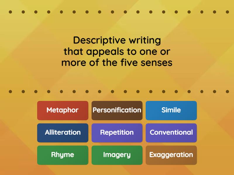 Imagery - Descriptive writing that appeals to one or more of the five senses, Conventional - Traditional (i.e., a “rose” conventionally symbolizes romance, love, or beauty), Metaphor - A comparison made by saying something is something else. She's got a heart of gold., Simile - A comparison made using the word ‘as’ or ‘like’. As quiet as a mouse, Personification - Giving something that is not alive human qualities. The flowers danced to the wind, Alliteration - When two or more words start with the same sound (often the same letter). Silly Sam, living life., Exaggeration - Making something sound better or worse than it actually is. I was walking along when suddenly this enormous dog walked along. It was as big as an elephant., Rhyme - Words, usually at the end of lines, that end with the same sound. Cat-bat, walk-talk, Repetition - Saying the same word/ idea/ theme for effect.,