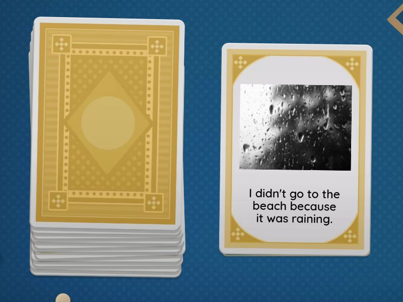 I didn't go to work because I was ill. , I was late and my boss was angry., I didn't buy the house because it was too expensive., I went to the beach and I got sunburnt., I didn't go to the beach because it was raining., I didn't watch the final because I was working., I wanted to buy a new car but I didn't have money., I couldn't sleep because the neighbors were noisy., I couldn't answer the phone becauseI was in the shower., I couldn't call her because I lost her number., I didn't know it was her birthday and didn't buy a present., I fell asleep at the cinema because the film was boring..