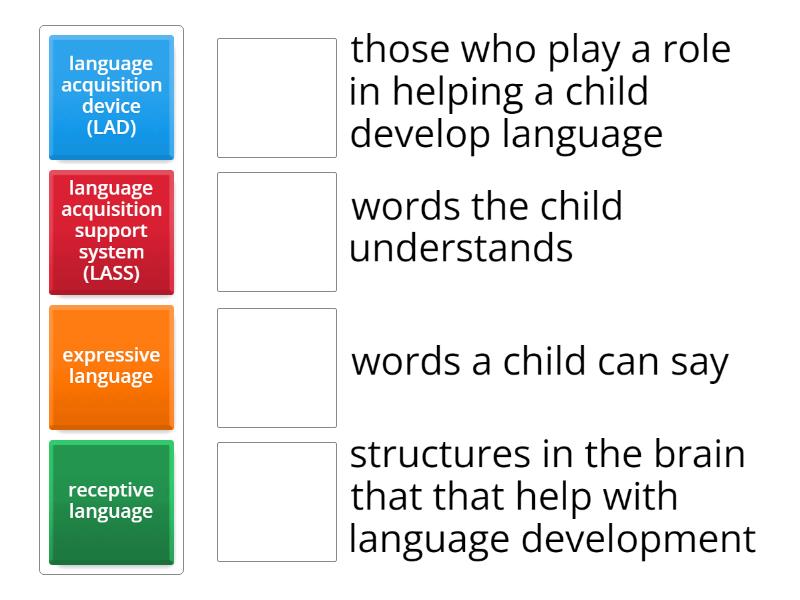 receptive language - words the child understands , expressive language - words a child can say, language acquisition device (LAD) - structures in the brain that that help with language development, language acquisition support system (LASS) - those who play a role in helping a child develop language,