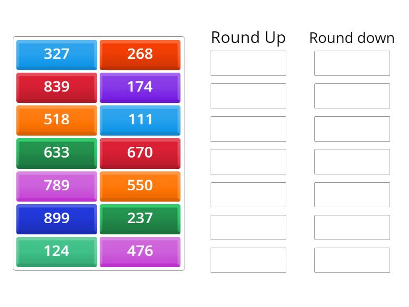 Round Up: 899, 789, 268, 550, 476, 174, 670, Round down: 111, 237, 124, 633, 327, 839, 518,