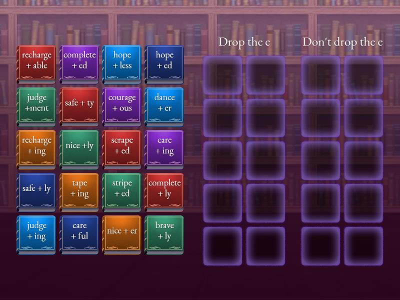 Drop the e: tape + ing, hope + ed, dance + er, care + ing, scrape + ed, nice + er, stripe + ed, complete + ed, recharge + ing, judge + ing, Don't drop the e: care + ful, safe + ty, hope + less, brave + ly, judge +ment, nice +ly, courage + ous, complete + ly, recharge + able, safe + ly,