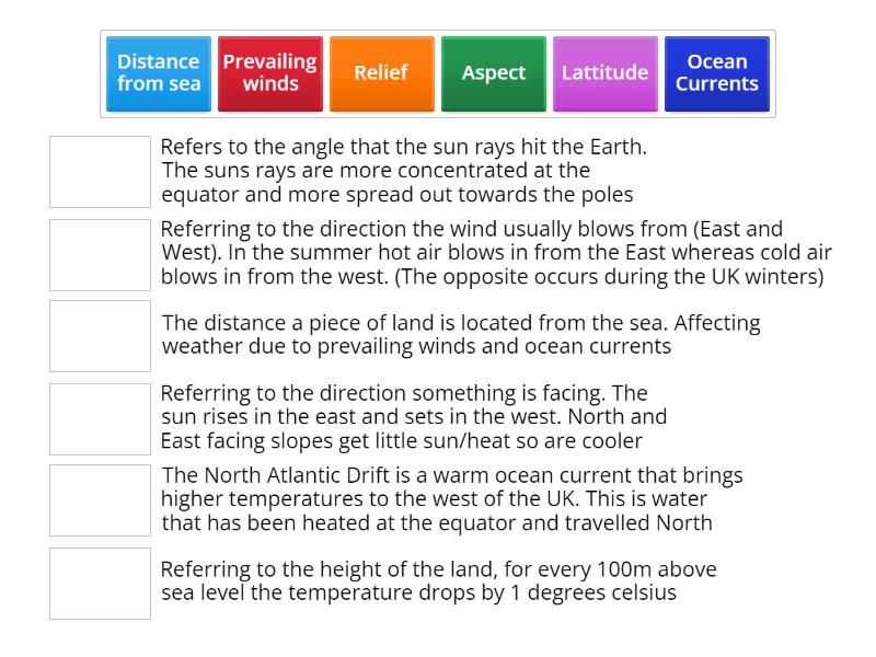 Relief - Referring to the height of the land, for every 100m above sea level the temperature drops by 1 degrees celsius, Lattitude - Refers to the angle that the sun rays hit the Earth. The suns rays are more concentrated at the equator and more spread out towards the poles, Aspect - Referring to the direction something is facing. The sun rises in the east and sets in the west. North and East facing slopes get little sun/heat so are cooler, Ocean Currents - The North Atlantic Drift is a warm ocean current that brings higher temperatures to the west of the UK. This is water that has been heated at the equator and travelled North, Prevailing winds - Referring to the direction the wind usually blows from (East and West). In the summer hot air blows in from the East whereas cold air blows in from the west. (The opposite occurs during the UK winters), Distance from sea - The distance a piece of land is located from the sea. Affecting weather due to prevailing winds and ocean currents ,