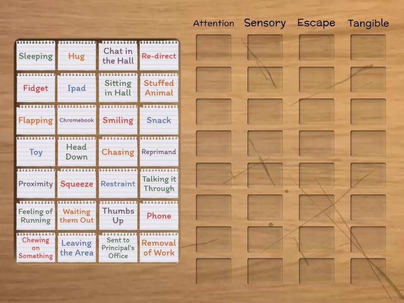 Attention: Re-direct, Reprimand, Talking it Through, Chasing, Smiling, Thumbs Up, Proximity, Chat in the Hall, Sensory: Restraint, Squeeze, Hug, Fidget, Chewing on Something, Feeling of Running, Flapping, Escape: Sleeping, Head Down, Removal of Work, Waiting them Out, Sent to Principal's Office, Sitting in Hall, Leaving the Area, Tangible: Snack, Ipad, Phone, Chromebook, Toy, Stuffed Animal,