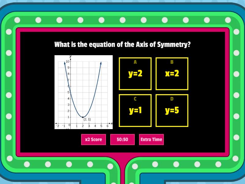 1) What is the equation of the Axis of Symmetry? a) y=2 b) x=2 c) y=1 d) y=5 2) How many zeros are there in this quadratic function? a) 1 b) 2 c) 0 3) What is the positive solution to this function? a) 0 b) -1 c) 3 d) -2 4) What is the minimum of this function? a) -5 b) -9 c) 1 d) -2 5) What is the maximum of this function? a) -2 b) -12 c) 4 d) 16 6) What are the coordinates of the vertex of this function? a) (1,4) b) (-2,0) c) (4,0) d) (4,1) 7) What is the domain of this function? a) -1 ≤ x ≤ 3 b) y ≤ -4 c) y ≥ -4 d) All real numbers 8) What is the range of this function? a) -1 ≤ x ≤ 3 b) y ≤ -4 c) y ≥ -4 d) All real numbers 9) How many solutions does this function have? a) 0 b) 1 c) 2 d) No Solutions 10) What is the equation of the axis of symmetry? a) y=0 b) x=0 c) x=-2 d) y=2 11) What are the coordinates of the vertex of this function? a) (-3,-2) b) (-2,-3) c) (-4.5,0.5) d) -2 12) What are the zeros of the quadratic function? a) x = -3 and x = 2 b) x = -4 and x = 1 c) x = -1 and x = 3 d) {-2,5} 13) Which statement appears to be true? a) The function has 3 zeros. b) The maximum value of the function is -2. c) The vertex of the graph of the function is (-2,0) d) The equation for the axis of symmetry is x =1. 14) What is the solution set of the quadratic function? a) x = 1 b) (-2,-1) c) {-3,-1} d) -1 15) Which answer choice best represents the x-intercepts of the graph? a) (0,-1) and (0,3) b) (-1,0) and (3,0) c) (1,-4) d) (-2,5) and (4,5) 16) What is the maximum value of the graph of the function? a) 5 b) 8 c) 9 d) 10 17) What are the coordinates of the vertex of this function? a) (0,12) b) (-2,0) c) (16,2) d) (2,16) 18) What is the y-intercept of the graph? a) (2,0) b) (4,0) c) (0,4) d) x = -2