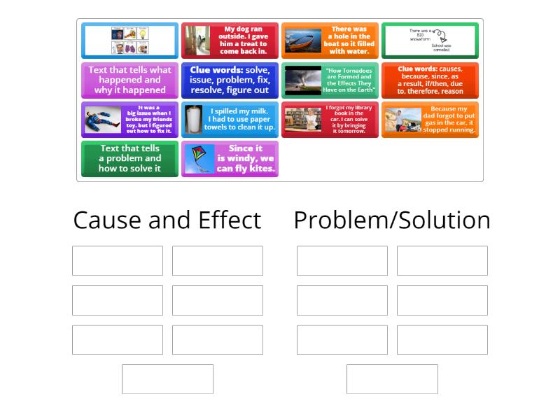 Cause and Effect: Text that tells what happened and why it happened, Clue words: causes, because, since, as a result, if/then, due to, therefore, reason, , There was a hole in the boat so it filled with water., "How Tornadoes are Formed and the Effects They Have on the Earth", Since it is windy, we can fly kites., Because my dad forgot to put gas in the car, it stopped running., Problem/Solution: Text that tells a problem and how to solve it, Clue words: solve, issue, problem, fix, resolve, figure out, , It was a big issue when I broke my friends toy, but I figured out how to fix it., I spilled my milk. I had to use paper towels to clean it up., My dog ran outside. I gave him a treat to come back in., I forgot my library book in the car. I can solve it by bringing it tomorrow.,