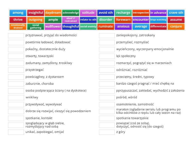 daydream - rozmarzyć, pogrążyć się w marzeniach, social gathering - spotkanie towarzyskie, recharge - powtórnie ładować, doładować, emotionally drained - wycieńczony, wyczerpany emocjonalnie, acknowledge - przyznawać, przyjąć do wiadomości, outgoing - otwarty, towarzyski, anxious - zaniepokojony, zatroskany, among - pośród, wśród, assume - pprzypuszczać, zakładać, wychodzić z założenia, conjure - przywoływać, wywoływać, wallflower - osoba podpierająca ściany ( na dyskotece), aloof // restrained - powściągliwy, z dystansem, introspective - spoglądający w głąb siebie, rozmyślający nad sobą, average - przeciętny, średni, typowy, encounter - spotkanie, kontakt, differentiate - odróżniać, rozróżniać, disorder - zaburznie, choroba, crave sth - bardzo czegoś pragnąć / mieć chętkę na, solitude - osamotnienie, samotność, ruminate - przemyśleć, rozmyślać, social anxiety - lęk społeczny, avoid sth - unikać, zapobiegać, omijać, in advance - z góry, thrive - dobrze się rozwijać, cieszyć się powodzeniem, binge-watching - maraton (oglądanie serialu lub programu po kilka odcinków z rzędu lub cały sezon na raz), ample - pokaźny, dostatecznie duży, forewarn - przystrzegać, relate to sth - powiązać (coś ze sobą), dotyczyć, odnosić się (do czegoś), insightful - wnikliwy, thoughtful - zadumany, zamyślony, troskliwy,