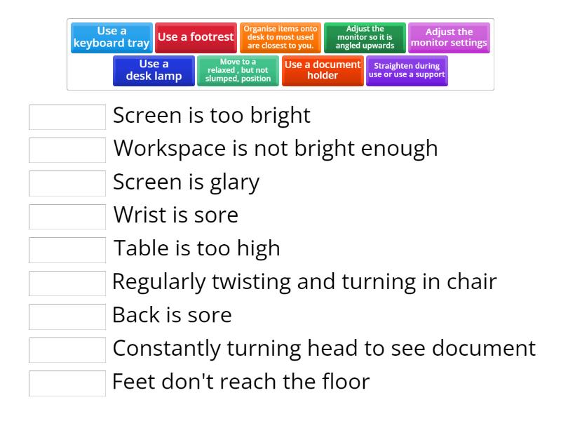 Use a document holder - Constantly turning head to see document, Organise items onto desk to most used are closest to you. - Regularly twisting and turning in chair, Use a desk lamp - Workspace is not bright enough, Move to a relaxed , but not slumped, position - Back is sore, Straighten during use or use a support - Wrist is sore, Adjust the monitor settings - Screen is too bright, Adjust the monitor so it is angled upwards - Screen is glary, Use a footrest - Feet don't reach the floor, Use a keyboard tray - Table is too high,
