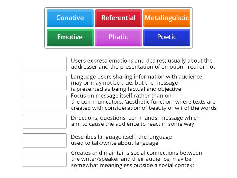 Referential - Language users sharing information with audience; may or may not be true, but the message is presented as being factual and objective, Emotive - Users express emotions and desires; usually about the addresser and the presentation of emotion - real or not, Phatic - Creates and maintains social connections between the writer/speaker and their audience; may be somewhat meaningless outside a social context, Metalinguistic - Describes language itself; the language used to talk/write about language, Poetic - Focus on message itself rather than on the communicators; ‘aesthetic function’ where texts are created with consideration of beauty or wit of the words, Conative - Directions, questions, commands; message which aim to cause the audience to react in some way,