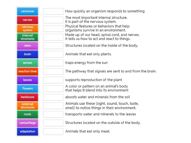 camouflage - A color or pattern on an animal's body that helps it blend into its environment, reaction time - How quickly an organism responds to something, nervous system - Made up of our head, spinal cord, and nerves. It tells us how to act and react to things., brain - The most important internal structure. It is part of the nervous system., adaptation - Physical features or behaviors that help organisms survive in an environment., nerves - The pathway that signals are sent to and from the brain., internal structures - Structures located on the inside of the body., external structures - Structures located on the outside of the body., senses - Animals use these (sight, sound, touch, taste, smell) to notice things in their environment., herbivore - Animals that eat only plants., carnivore - Animals that eat only meat., stem - transports water and minerals to the leaves, roots - absorb water and minerals from the soil, leaves - traps energy from the sun, flowers - supports reproduction of the plant,
