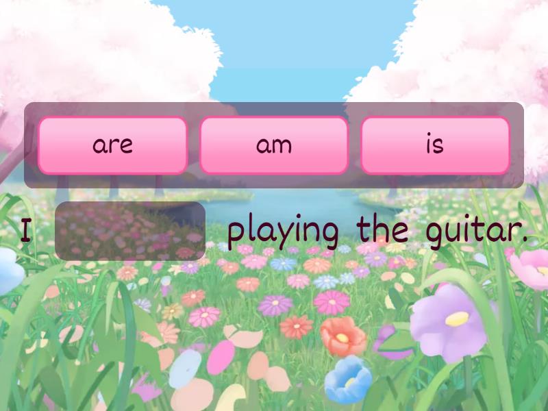 I ____ playing the guitar. You ____ playing tennis. He ____ playing football. She ____ playing the guitar. We ____ riding bikes. They ____ swimming. Tom ____ watching television. Jim and Pete ____ playing basketball. I ____ playing with a ball