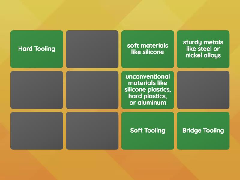 Soft Tooling - soft materials like silicone, Bridge Tooling - unconventional materials like silicone plastics, hard plastics, or aluminum, Hard Tooling - sturdy metals like steel or nickel alloys, Injection Molds - creating plastic components, Blow Molds - creating hollow plastic products, Rotational Molds - creating large components with thicker walls,