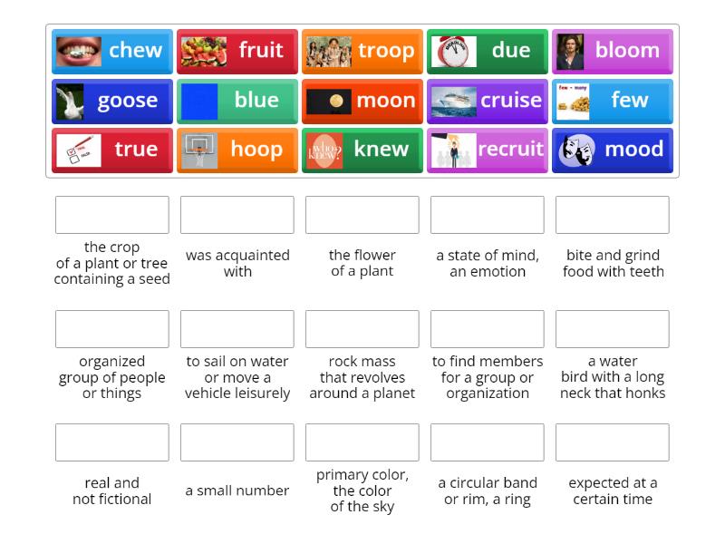bloom - the flower of a plant, blue - primary color, the color of the sky, chew - bite and grind food with teeth, cruise - to sail on water or move a vehicle leisurely, due - expected at a certain time, few - a small number, fruit - the crop of a plant or tree containing a seed, goose - a water bird with a long neck that honks, hoop - a circular band or rim, a ring, knew - was acquainted with, mood - a state of mind, an emotion, moon - rock mass that revolves around a planet, recruit - to find members for a group or organization, troop - organized group of people or things, true - real and not fictional,