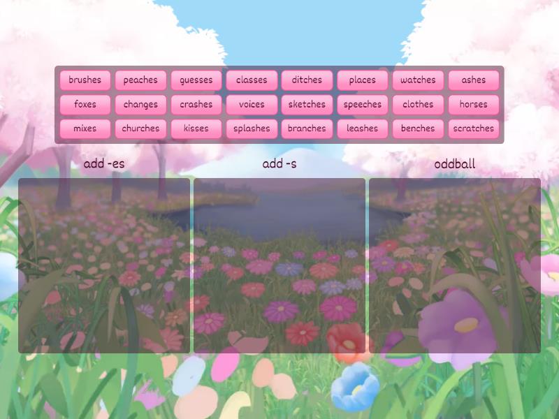 add -es: benches, speeches, scratches, churches, peaches, sketches, ditches, branches, watches, brushes, splashes, crashes, ashes, leashes, foxes, mixes, guesses, kisses, classes, add -s: horses, voices, changes, places, oddball: clothes,
