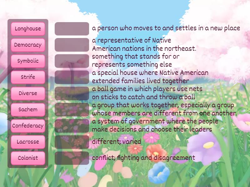Diverse - different; varied, Strife - conflict; fighting and disagreement, Confederacy - a group that works together, especially a group whose members are different from one another., Colonist - a person who moves to and settles in a new place, Democracy - a system of government where the people make decisions and choose their leaders, Longhouse - a special house where Native American extended families lived together, Sachem - a representative of Native American nations in the northeast., Symbolic - something that stands for or represents something else, Lacrosse - a ball game in which players use nets on sticks to catch and throw a ball,