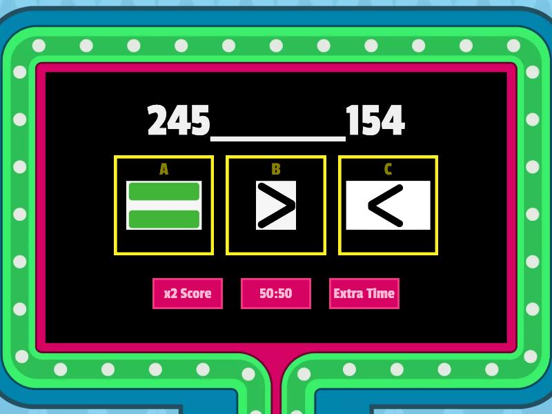1) 245_______154 a) b) c) 2) 658_______289 a) b) c) 3) 324_______ 20 + 4 + 300 a) b) c) 4) 398_______ 42 tens a) b) c) 5) 178_______ 200 + 20+ 2 a) b) c) 6) 20 + 400 + 3 _______ 355 a) b) c) 7) 408_______409 a) b) c) 8) one hundred seventy _______ one hundred seven a) b) c) 9) 74 tens _______ 7 hundreds + 4 tens a) b) c) 10) 847_______447 a) b) c)