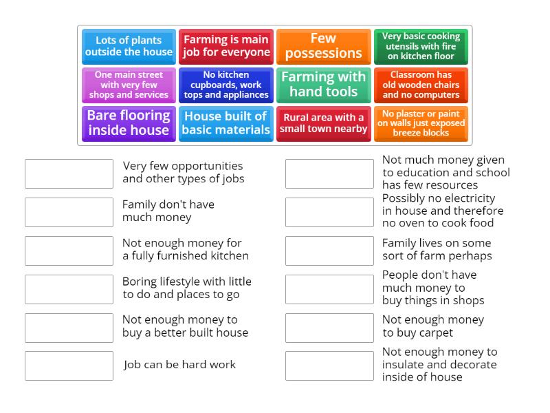 House built of basic materials - Not enough money to buy a better built house, Lots of plants outside the house - Family lives on some sort of farm perhaps, Farming with hand tools - Job can be hard work, No plaster or paint on walls just exposed breeze blocks - Not enough money to insulate and decorate inside of house, Bare flooring inside house - Not enough money to buy carpet , Very basic cooking utensils with fire on kitchen floor - Possibly no electricity in house and therefore no oven to cook food, No kitchen cupboards, work tops and appliances - Not enough money for a fully furnished kitchen, One main street with very few shops and services - People don't have much money to buy things in shops , Classroom has old wooden chairs and no computers - Not much money given to education and school has few resources, Farming is main job for everyone - Very few opportunities and other types of jobs, Few possessions - Family don't have much money, Rural area with a small town nearby - Boring lifestyle with little to do and places to go,
