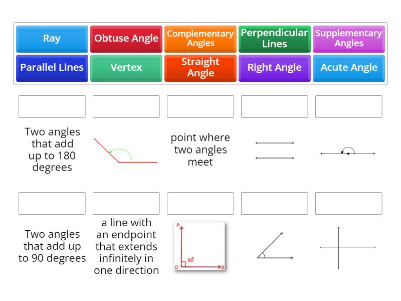 Right Angle, Acute Angle, Obtuse Angle, Straight Angle, Complementary Angles - Two angles that add up to 90 degrees, Supplementary Angles - Two angles that add up to 180 degrees, Parallel Lines, Perpendicular Lines, Vertex - point where two angles meet, Ray - a line with an endpoint that extends infinitely in one direction,