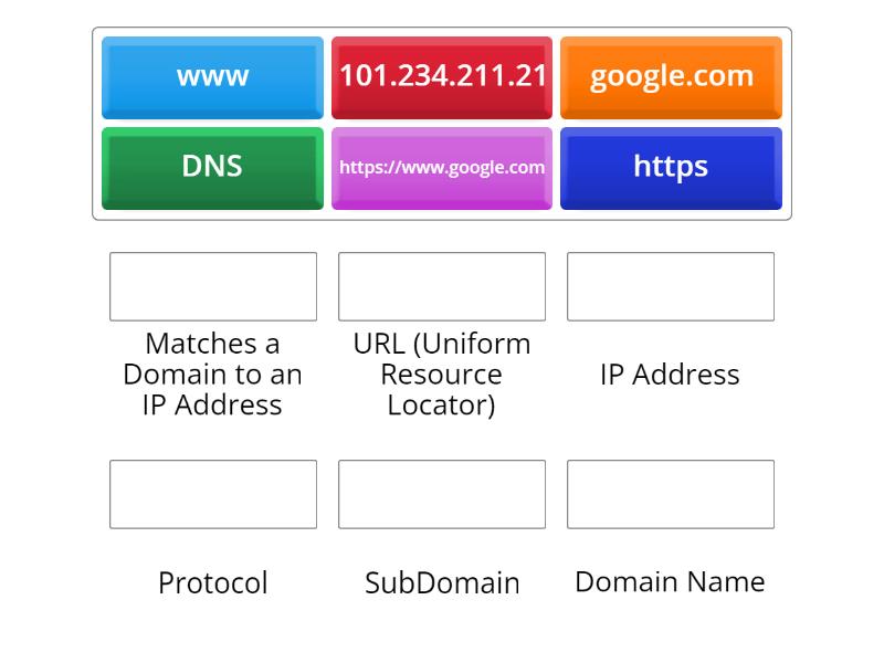 https://www.google.com - URL (Uniform Resource Locator), google.com - Domain Name, https - Protocol, www - SubDomain, 101.234.211.21 - IP Address, DNS - Matches a Domain to an IP Address,