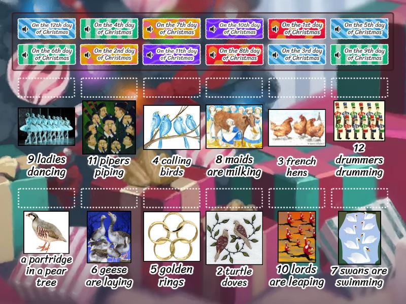 On the 1st day of Christmas - a partridge in a pear tree, On the 2nd day of Christmas - 2 turtle doves, On the 3rd day of Christmas - 3 french hens, On the 4th day of Christmas - 4 calling birds, On the 5th day of Christmas - 5 golden rings, On the 6th day of Christmas - 6 geese are laying, On the 7th day of Christmas - 7 swans are swimming, On the 8th day of Christmas - 8 maids are milking, On the 9th day of Christmas - 9 ladies dancing , On the 10th day of Christmas - 10 lords are leaping, On the 11th day of Christmas - 11 pipers piping, On the 12th day of Christmas - 12 drummers drumming,
