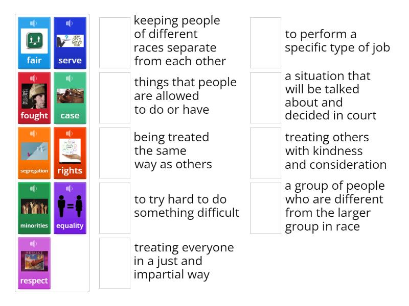 serve - to perform a specific type of job, segregation - keeping people of different races separate from each other, case - a situation that will be talked about and decided in court, rights - things that people are allowed to do or have, fought - to try hard to do something difficult, equality - being treated the same way as others, minorities - a group of people who are different from the larger group in race, fair - treating everyone in a just and impartial way, respect - treating others with kindness and consideration,