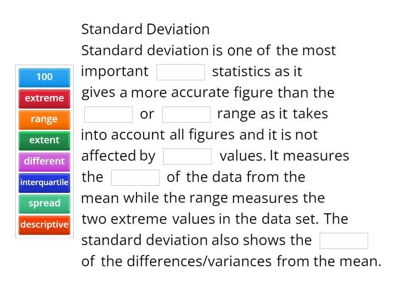Standard Deviation Standard deviation is one of the most important ____ statistics as it gives a more accurate figure than the ____ or ____ range as it takes into account all figures and it is not affected by ____ values. It measures the ____ of the data from the mean while the range measures the two extreme values in the data set. The standard deviation also shows the ____ of the differences/variances from the mean. Proportional symbols It is clear to see which values are higher or lower by comparing the ____ of the symbols. They can be used for both a precise ____ or a ____ area (country). You are able to extract ____ from the map by using the ____ to estimate the size of the population. However the ____ of the symbols can mean ____ and therefore difficulty ____ the values. The size of the symbol can also mean that the precise location of the city can be ____ . Spearman's Rank Spearman rank correlation coefficient measures the ____ and direction of a relationship between two variables and ranges from ____ The technique is used to either accept or reject the ____ hypothesis. The further from ____, the stronger the relationship. A negative result indicates a ____ relationship. Spearman’s is easy to use & can identify relationships quickly, especially if a ____ has already been drawn because it uses rank values. However, ____ values can reduce the reliability of the test (1). At least ____ data sets are needed to allow this statistical test to be used reliably. Spearman's is ____ and easier to calculate than ____ product. Due to ranking, ____ values are not taken into account. Pearson's product moment correlation Pearson's measures the strength of a ____ relationship between ____ variables. Ranges from 1 to -1, with values of -1 representing the strongest possible ____ correlation, 1 representing the strongest possible ____ correlation and 0 representing ____ correlation. Pearson’s is a robust test that is more accurate than Spearman’s because it uses ____ values rather than ____ values. A high degree of correlation does not mean a close ____ between variables and this test takes a ____ time to calculate. Nearest neighbour This is used to measure ____ (clustered, random or regular). It can be used with any feature that can be regarded as being ____ at a specific point. However it is not precise when there is more than one ____ and no account is taken of the influence of the ____ landscape on the location features which can ____ the results. The areas compared must be of similar ____ otherwise results will be unreliable. It is very quick and easy to ____. NNI brings a level of ____ and confidence (95% and 99%) that graphs and maps do not allow.