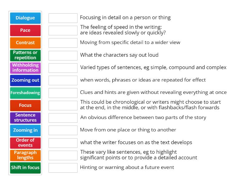 Shift in focus - Move from one place or thing to another, Dialogue - What the characters say out loud, Patterns or repetition - when words, phrases or ideas are repeated for effect, Focus - what the writer focuses on as the text develops, Pace - The feeling of speed in the writing: are ideas revealed slowly or quickly?, Withholding information - Clues and hints are given without revealing everything at once, Paragraph lengths - These vary like sentences, eg to highlight significant points or to provide a detailed account, Sentence structures - Varied types of sentences, eg simple, compound and complex, Order of events - This could be chronological or writers might choose to start at the end, in the middle, or with flashbacks/flash forwards, Foreshadowing - Hinting or warning about a future event, Zooming out - Moving from specific detail to a wider view, Contrast - An obvious difference between two parts of the story, Zooming in - Focusing in detail on a person or thing,