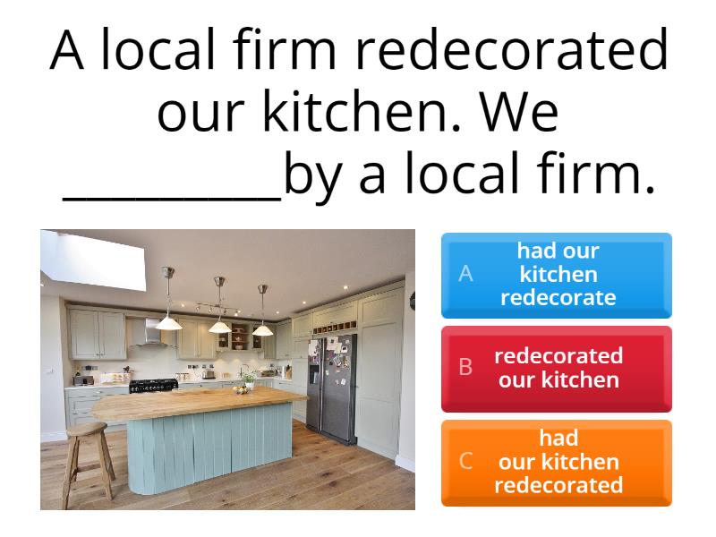 1) A local firm redecorated our kitchen. We _________by a local firm. a) had our kitchen redecorate b) redecorated our kitchen c) had our kitchen redecorated 2) A doctor took out her tonsils when she was six. She________when she was six. a) took out her tonsils b) had her tonsils taken out c) had her tonsils took out 3) The hairdresser should cut your hair. It's too long and untidy! You_________. It's too long and untidy! a) should have your hair cut. b) should cut your hair. c) should have her hair cut. 4) When I was coming here, someone stole my purse on the bus. When I was coming here, I__________on the bus. a) had stolen my purse b) had someone to stole my purse c) had my purse stolen 5) There was a leak in the roof so they're fixing it now. There was a leak in the roof so I___________now. a) had my roof fix b) 'm having my roof fixed c) 'm repairing my roof 6) You don't have to wash your clothes. You can ... a) get washed your clothes by them. b) get your clothes washed. c) wash your clothes yourself. 7) Why did you go to the dentist? a) To get my teeth checked. b) To check my teeth. c) to repair my tooth. 8) Why did you call the Pimlico Company? a) To have the plumber to check the kitchen pipes. b) To have checked the kitchen pipes. c) To have a plumber check the kitchen pipes. 9) Why did the boss contact Canon Inc? a) To get a photographer to take our photo. b) to have taken photos. c) take photos of the company. 10) Granny can't walk very well. a) She needs get examine her knee again. b) She needs take the doctor see her knee again. c) She needs to have the doctor check her knee again.