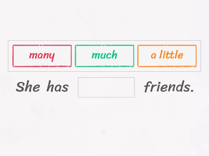 She has ____ friends. It needs ____ salt. They don't have ____ soda. I don't have ____ questions. She doesn't need ____ help. I need ____ onions. We don't have ____ ideas. How ____ olive oil do we need? How ____ brothers do you have? How ____ money do you need?