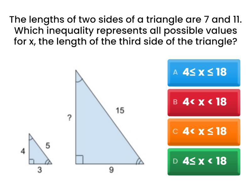 1) The lengths of two sides of a triangle are 7 and 11. Which inequality represents all possible values for x, the length of the third side of the triangle? a) 4≤ x ≤ 18 b) 4< x < 18 c) 4< x ≤ 18 d) 4≤ x < 18 2) If two sides of a triangle have lengths of 4 and 10, the third side could be a) 6 b) 16 c) 8 d) 4 3) Given two sides 7 cm. and 4 cm., what is the possible lengths of the third side? a) 3<x<11 b) 4<x<15 c) 5<x<11 d) 11<x<3 4) The Triangle Inequality Theorem states the sum of the lengths of any two sides of a triangle is ________________ the length of the third side. a) less than or equal to b) equal c) greater than or equal to d) greater than 5) Can we form a triangle a) b) c) d) 6) x=? a) b) c) d) 7) s=? a) b) c) d) 8) solve for x and y a) x=3 b) x=4 c) y=3 d) y=10 e) x=5 f) y=5 9) solve for x a) b) c) d) 10) Solve for the missing side a) b) c) d) 11) Find both missing sides. a) PR=8 b) PQ= 2 c) PQ= 8 d) PR=14