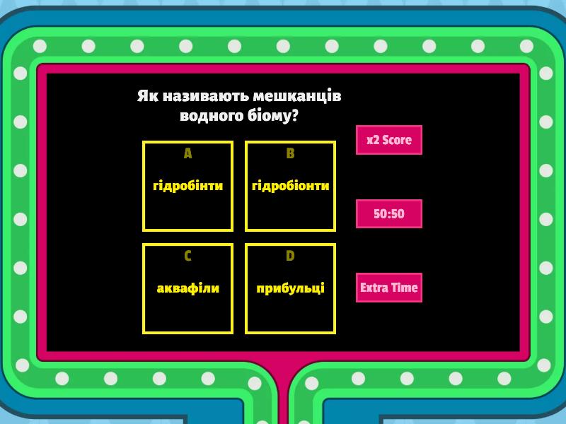 1) Як називають мешканців водного біому? a) гідробінти b) гідробіонти c) аквафіли d) прибульці 2) Як називається рослина зображена на малюнку? a) підводна кульбабка b) білий цвіт c) водяний горіх d) морський змій 3) Що допомагає рибам рухатися і зберігати баланс в воді? a) Плавці та хвіст b) зябри c) лапи d) хребет 4) Навіщо рибам плавальний міхур? a) щоб виглядати симпатично b) вони зміцнюють щільність тіла і регулюють глибину занурення c) Щоб відлякувати ворогів 5) Які ознаки пристосування рослин до нестачі світла у воді? a) гарний вигляд, довге коріння b) листочки c) Довге коріння, вузькі або м`ясисті листки d) не знаю( 6) Яка основна хімічна речовина води? a) гелій b) водень c) h2o d) co2 7) Як називаються складові гідросфери? a) світовий океан, води суходолу, води в атмосфері  b) кисень, азот, вуглекислий газ c) земна кора та субстрат 8) Про кого це? Відомий також під назвою морська видра - мешканець Курильських островів, Алеутова і островів біля узбережжя південно-західної Канади. a) морський котик b) морж c) невідоме створіння d) морський калан 9) Хто намальований на малюнку? a) бактерія b) гусениця c) тихоходка d) жаба