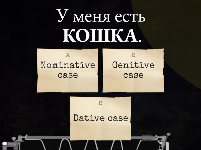 1) У меня есть КОШКА.    a) Nominative case b) Genitive case c) Dative case 2) У меня нет СОБАКИ.  a) Nominative case b) Genitive case c) Dative case 3) Сегодня идёт ДОЖДЬ.  a) Nominative case b) Genitive case c) Dative case 4) Сегодня нет СОЛНЦА .  a) Nominative case b) Genitive case c) Dative case 5) Самолёт летит ПО НЕБУ. a) Nominative case b) Genitive case c) Dative case 6) Я даю яблоко СЕСТРЕ.  a) Nominative case b) Genitive case c) Dative case 7) Мой друг ИЗ РОССИИ.  a) Nominative case b) Genitive case c) Dative case 8) Я стою ОКОЛО ДЕРЕВА.  a) Nominative case b) Genitive case c) Dative case 9) Это мой ДРУГ.  a) Nominative case b) Genitive case c) Dative case 10) Я помогаю ДРУГУ.  a) Nominative case b) Genitive case c) Dative case 11) Я иду К БАБУШКЕ .  a) Nominative case b) Genitive case c) Dative case 12) Дети идут ИЗ ШКОЛЫ.  a) Nominative case b) Genitive case c) Dative case 13) Лодка плывёт ПО РЕКЕ.  a) Nominative case b) Genitive case c) Dative case 14) Медведь больше ВОЛКА.  a) Nominative case b) Genitive case c) Dative case