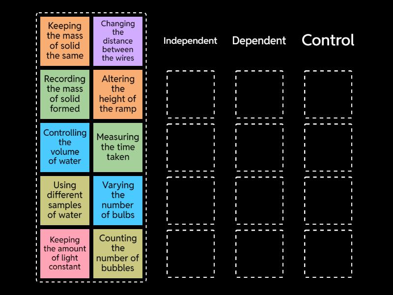 Independent: Changing the distance between the wires, Altering the height of the ramp, Using different samples of water, Varying the number of bulbs, Dependent: Measuring the time taken, Counting the number of bubbles, Recording the mass of solid formed, Control: Controlling the volume of water, Keeping the mass of solid the same, Keeping the amount of light constant,