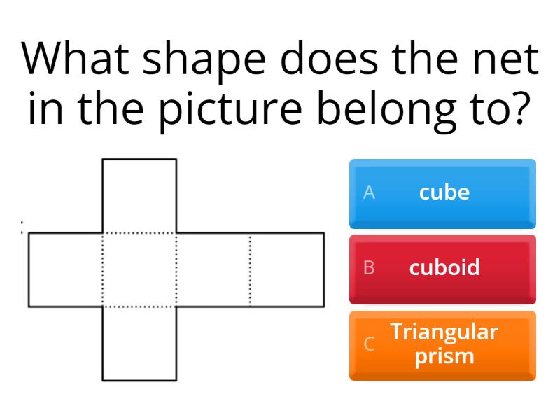 1) What shape does the net in the picture belong to? a) cube b) cuboid c) Triangular prism 2) What shape does the net in the picture belong to? a) Triangular prism b) Hexagonal prism c) Pentagonal prism 3) What shape does the net in the picture belong to? a) Cone b) Cylinder c) Sphere 4) What shape does the net in the picture belong to? a) Cube b) Square based pyramid c) Triangular prism 5) What shape does the net in the picture belong to? a) Tetrahedron b) Octahedron c) Dodecahedron
