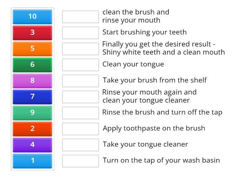 9 - Rinse your mouth again and clean your tongue cleaner, 10 - Finally you get the desired result - Shiny white teeth and a clean mouth, 8 - Clean your tongue, 1 - Take your brush from the shelf, 3 - Rinse the brush and turn off the tap, 2 - Turn on the tap of your wash basin, 4 - Apply toothpaste on the brush, 5 - Start brushing your teeth, 6 - clean the brush and rinse your mouth, 7 - Take your tongue cleaner,