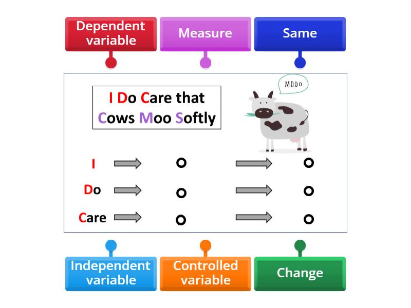Independent variable, Dependent variable, Controlled variable, Change, Measure, Same.